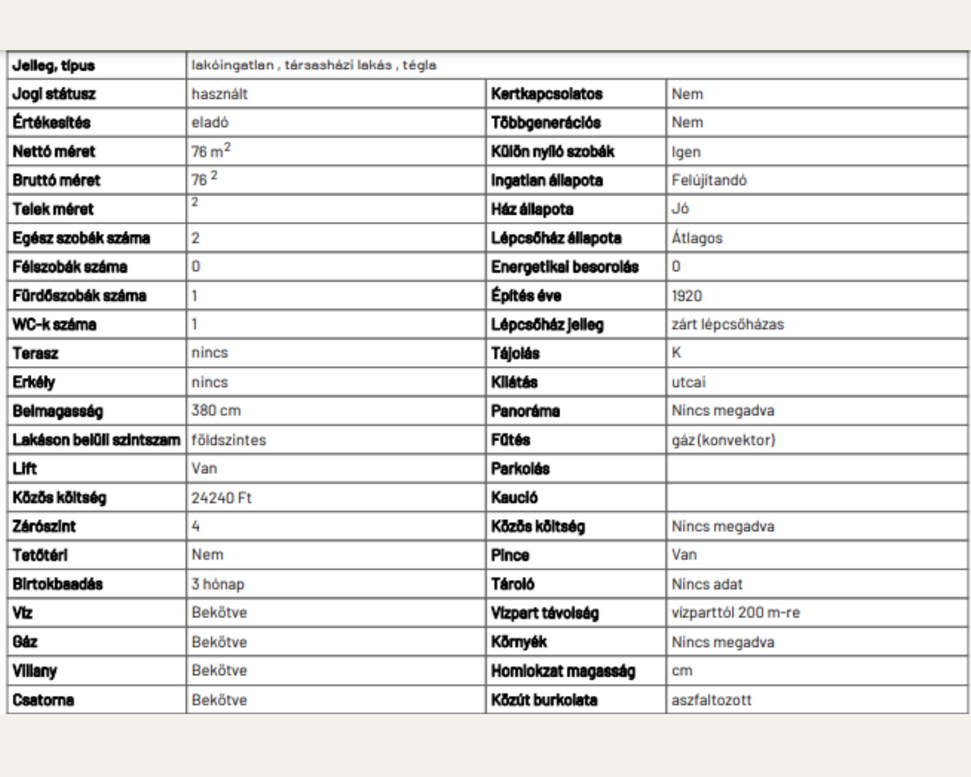 Bár a lakás felújításra szorul, a lehetőségek végtelenek! A cserépkályha és a konvektor fűtés garantálja a meleg és kellemes klímát, így még a hidegebb napokon sem kell aggódnia. Az önálló pince extra tárolóhelyet biztosít, ahol kényelmesen elhelyezheti extra holmijait.